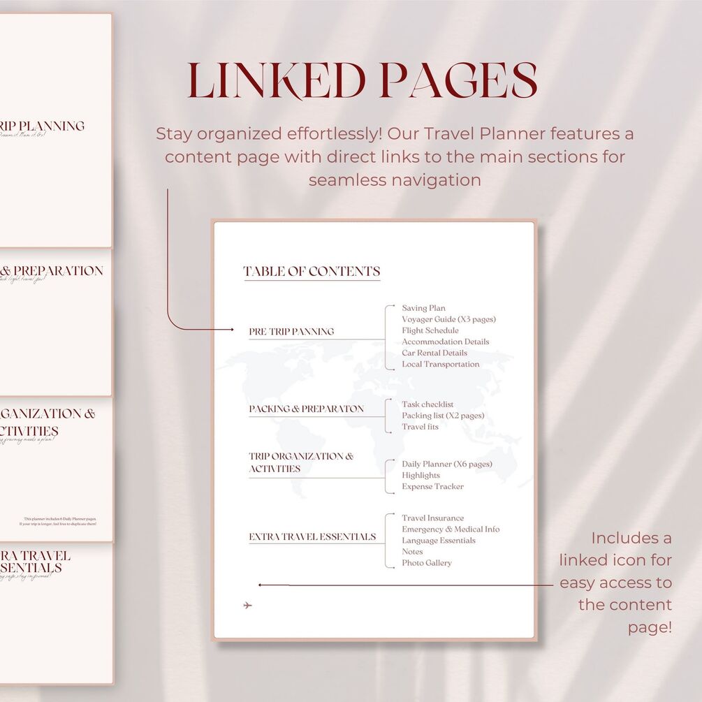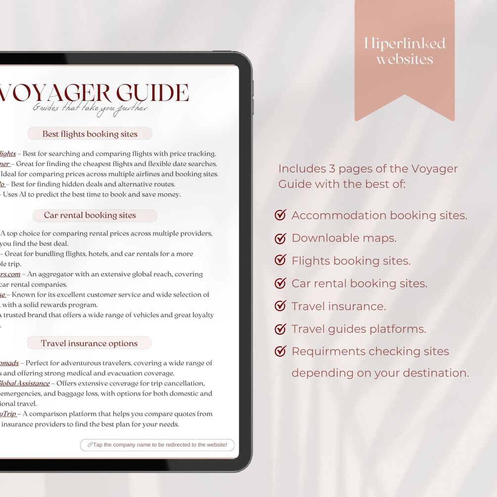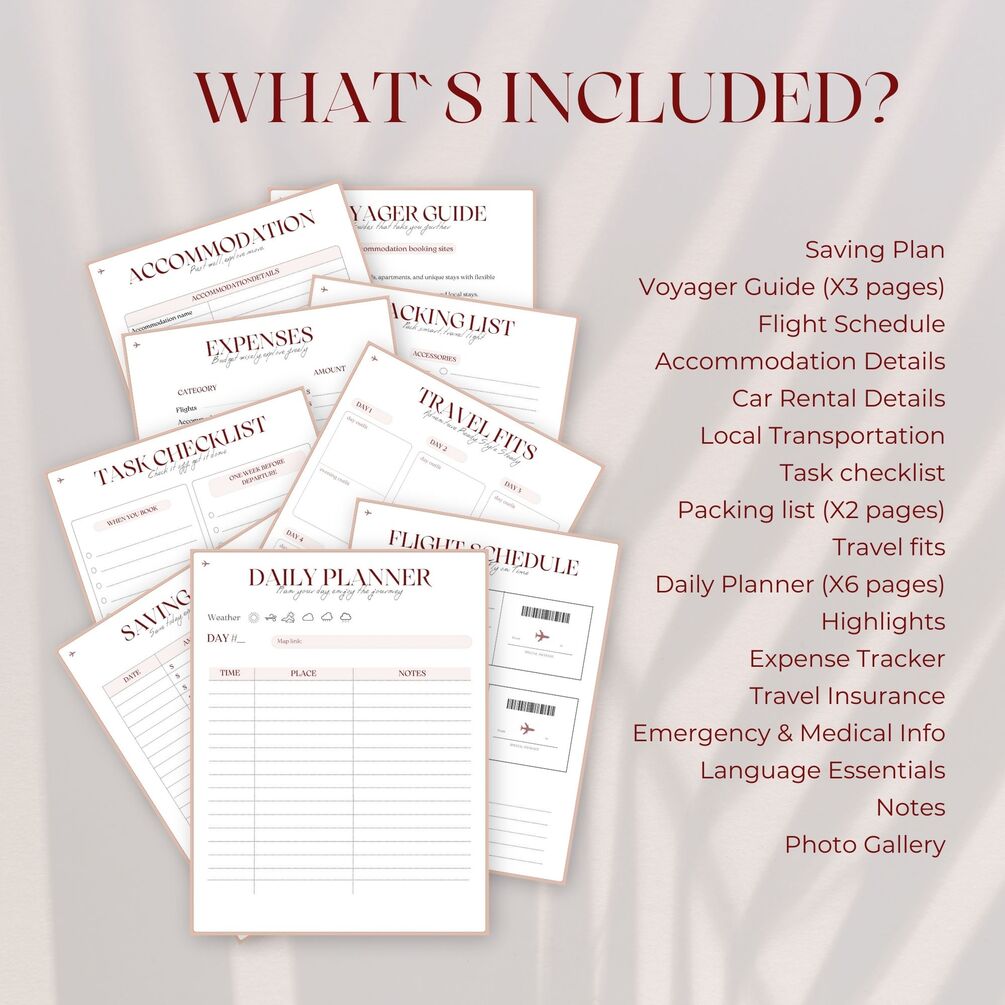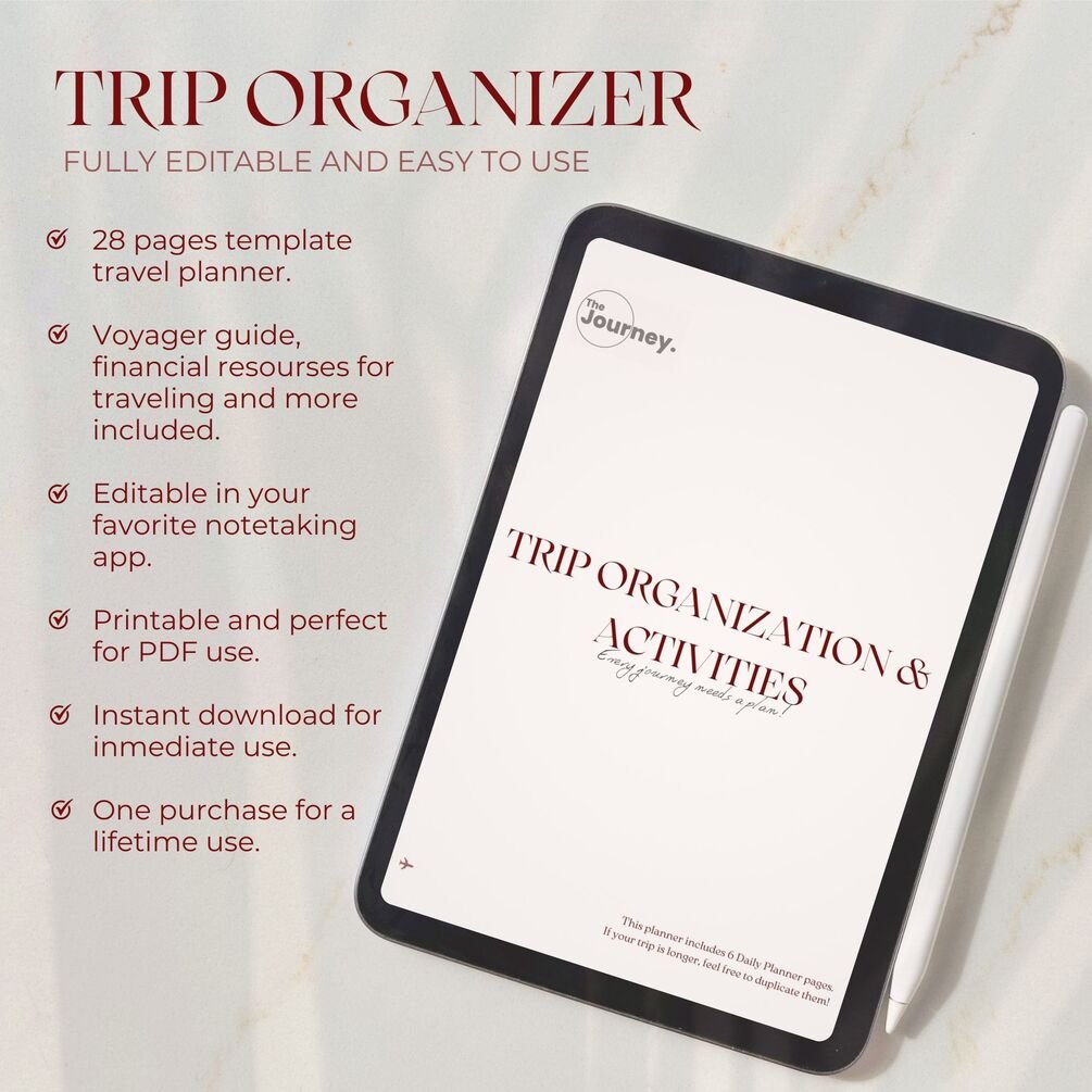 The Ultimate Travel Planner + Exclusive Travel Guide! โœˆ๏ธ This all-in-one digital tool helps you organize your itinerary, track expenses, plan outfits, and pack like a pro, all while including an exclusive Travelerโ€™s Guide with expert tips for a stress-free trip. Whether you're a backpacker, solo traveler, or planning a family or friends trip, this planner adapts to your needs and ensures you stay organized and enjoy every moment of your journey. Easy to edit, print, or use on your device. Instant downloadโ€”start planning today! ๐Ÿš€